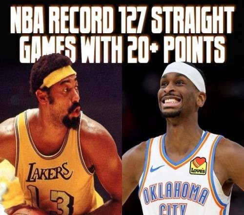 连续127场得分20+只统计常规赛的数据。上赛季的季后赛,亚历山大有过3场得分不到20分。此外,亚历山大在连续127场砍下20+的比赛中,有过两次得分正好是20分,且都出现在本赛季雷霆大比分获胜的比赛里。